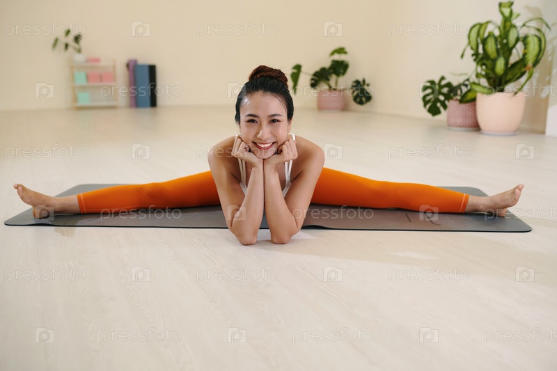 Улыбающаяся азиатская женщина занимается йогой Разделяется на йога-матке