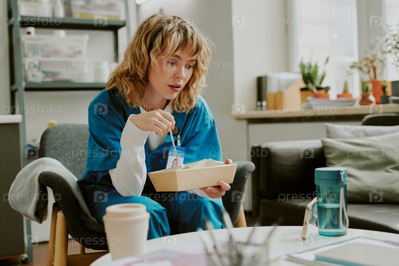 Медсестра ест салат Молодой