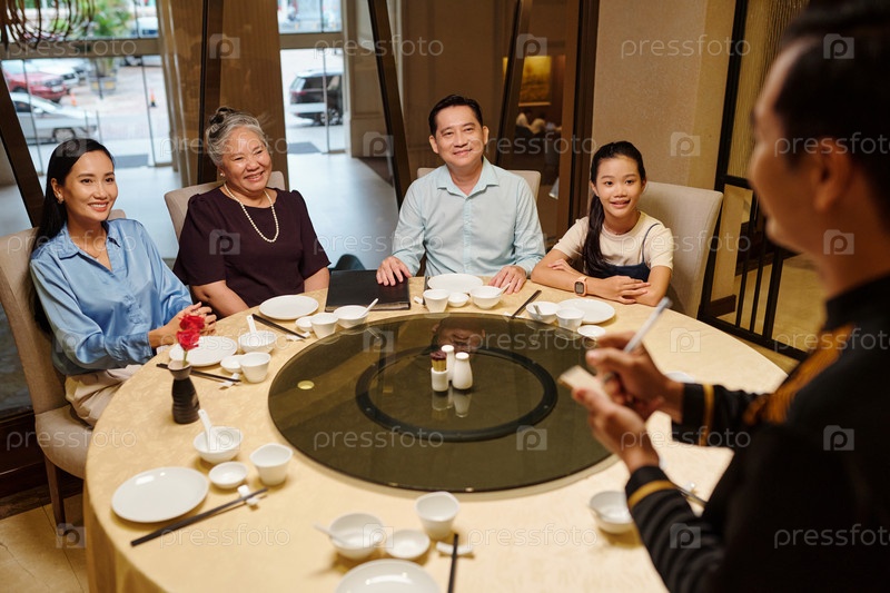 Семья разговаривает с официантом азиатский