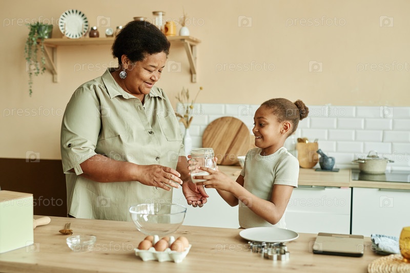 Ребенок, удерживающий банку для приготовления блинов помогает бабушке на кухне