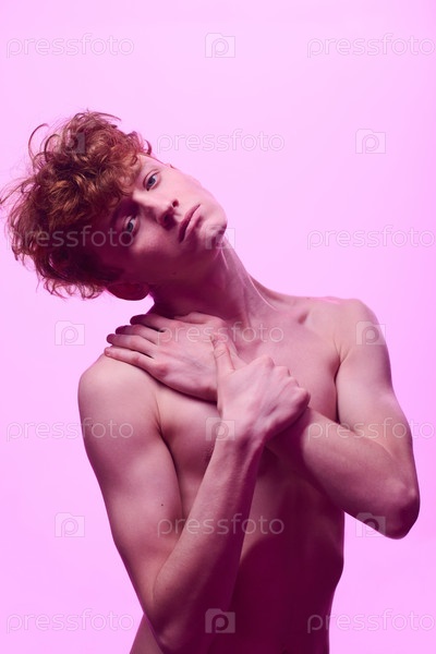 Позиция без рубашки на розовом фоне с рукой возле груди