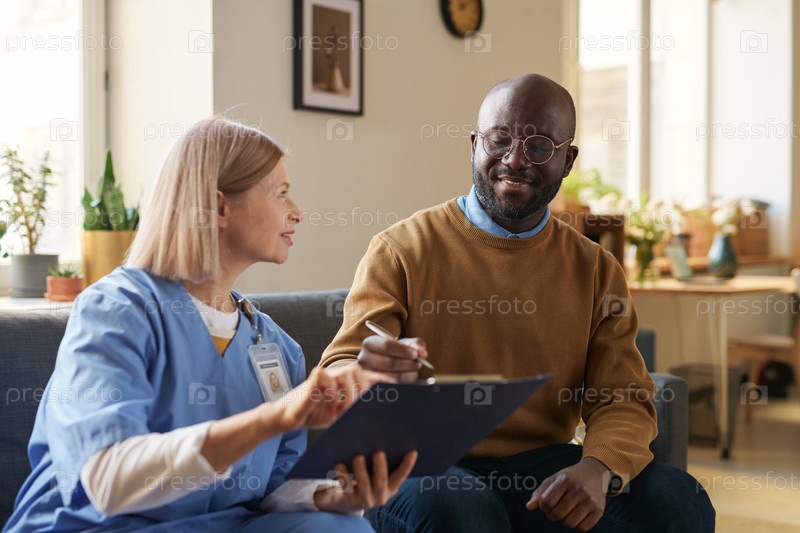 Черный человек подписывает соглашение на Клипборде