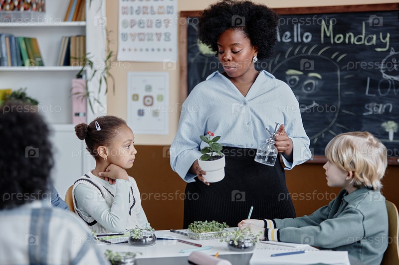Молодые ориентированные студенты изучают фотосинтез в классе
