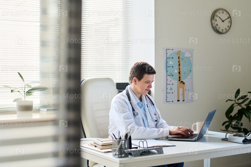 Медицинский специалист, использующий ноутбук в педиатрическом кабинете