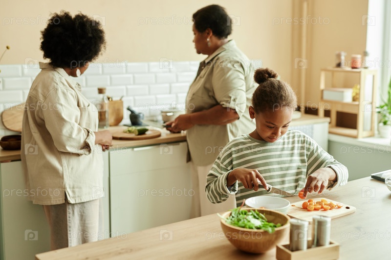 Черная девушка с семьей, нарезающая помидоры для свежего салата на кухне