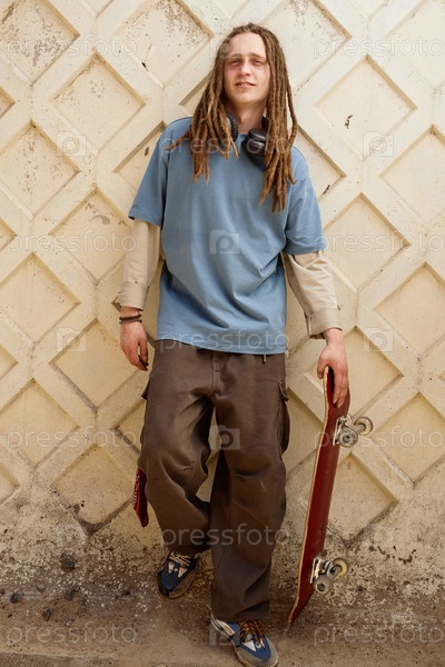 Энтузиаст по скейтбордингу позирует со skateboard