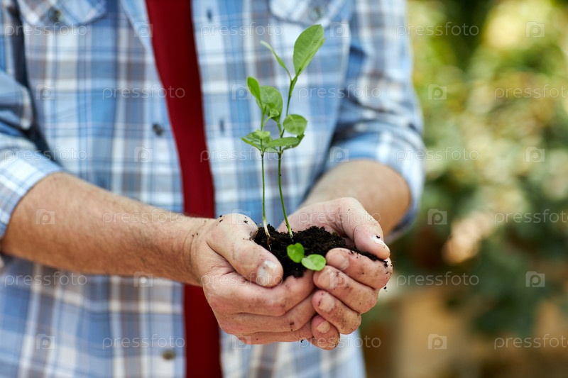 Маленькие саженцы с почвой в руках держатся на открытом воздухе