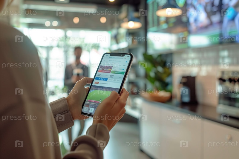 Человек, использующий смартфон для онлайн-деятельности в современном кафе