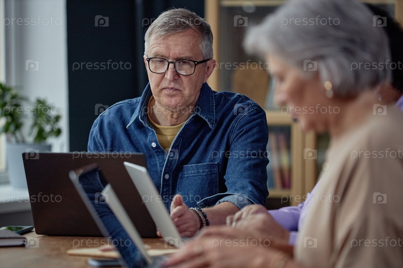 Беловолосый зрелый мужчина использует компьютер, носящий очки