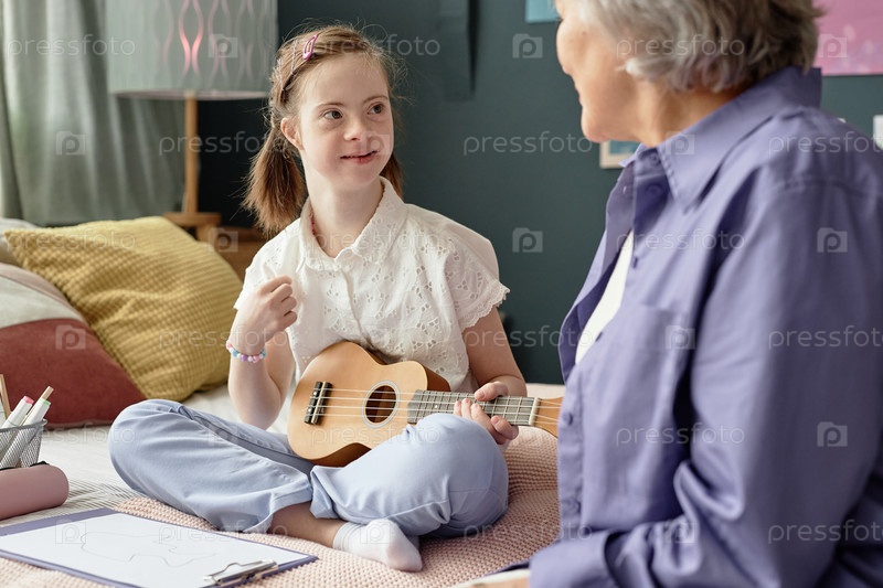 Портрет девушки, играющей на укулеле, сидя с старшим