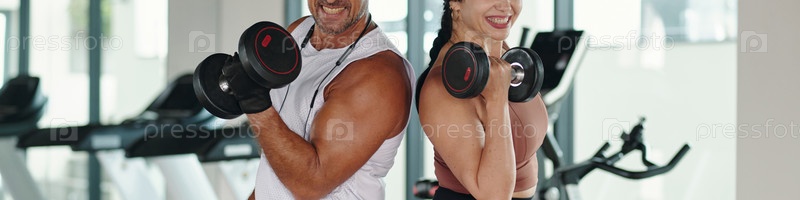 Пара, занимающаяся гантельками в тренажерном зале