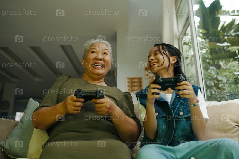 Бабушка играет на консоли со своей внучкой