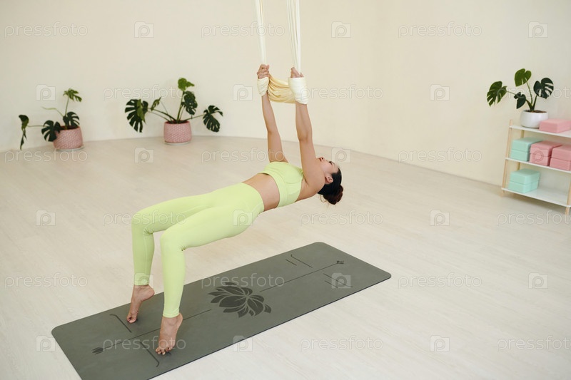 Практика воздушных поз йоги в минималистической современной студии