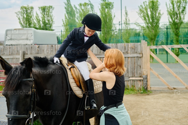 Помощь ребенку с уроком верховой езды на открытом воздухе