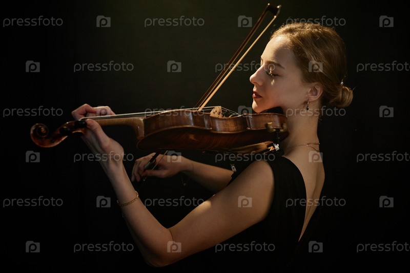 Женская скрипач драматически играет классическую музыку под ярким светом