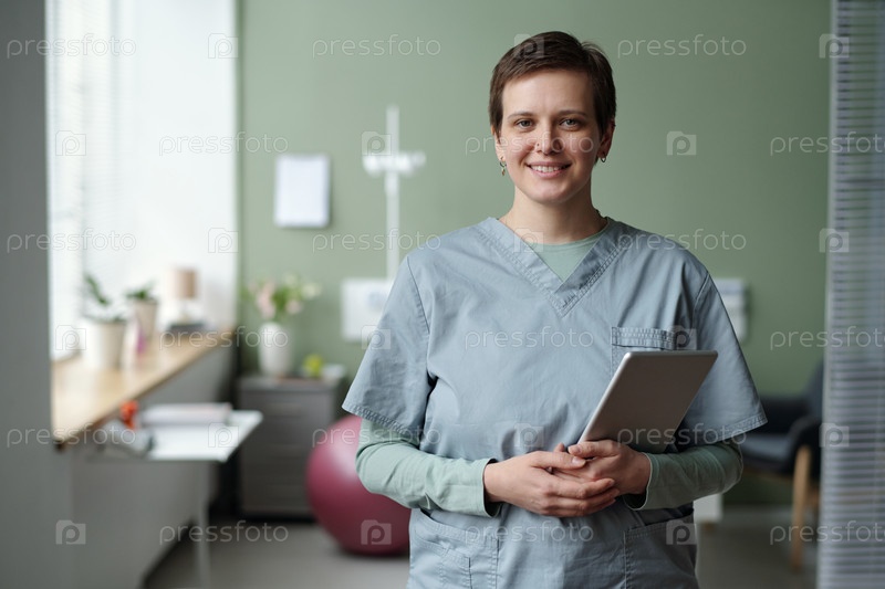 Улыбающаяся медсестра держит планшет в больничной комнате