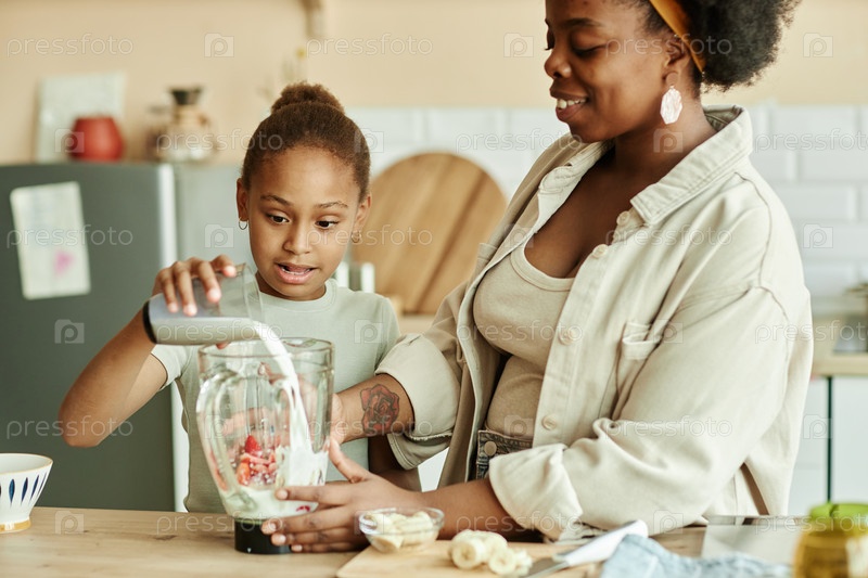 Маленькая дочь и мама делают смузи Добавление молока в блендер