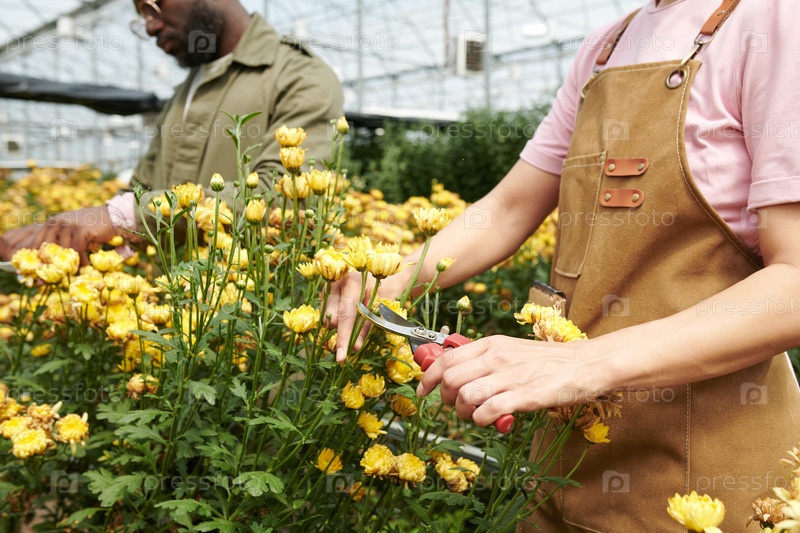 Женщина-садовник режет желтые цветы в теплице