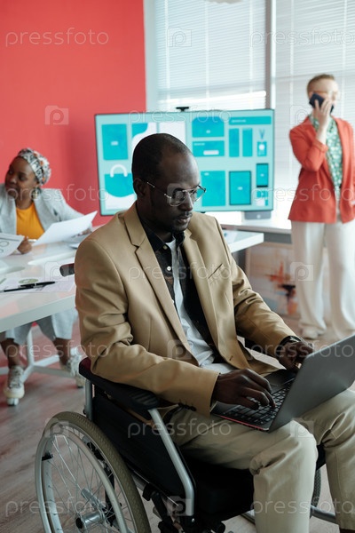 Человек на инвалидном кресле использует ноутбук в офисе