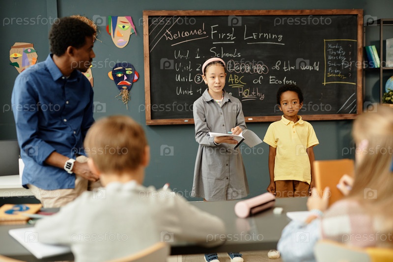 Мальчик и девочка, представляющие домашнее задание Результаты для класса в классе мальчик