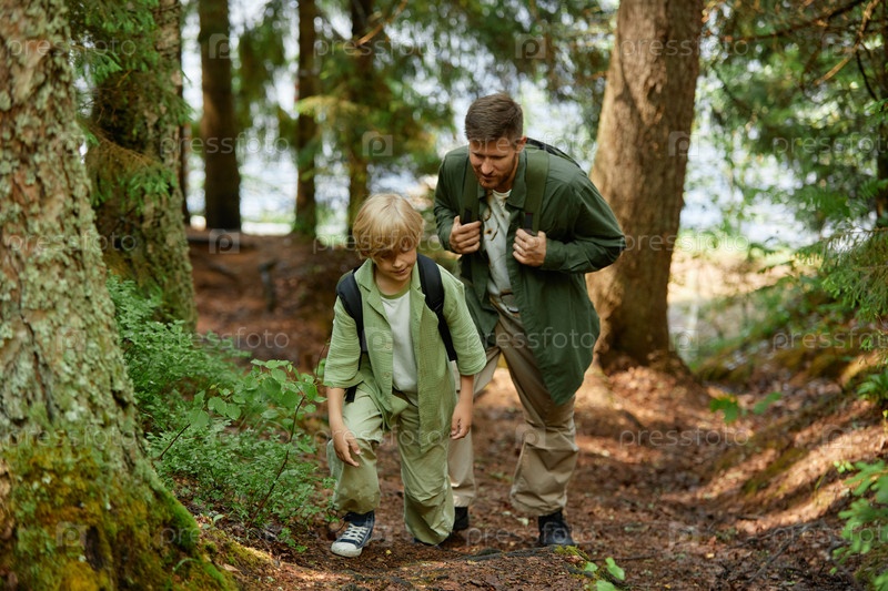 Отец и сын вместе исследуют лес, нося рюкзаки