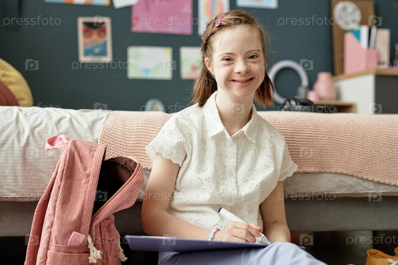 Портрет девочки с синдромом Дауна, улыбающейся и рисующей