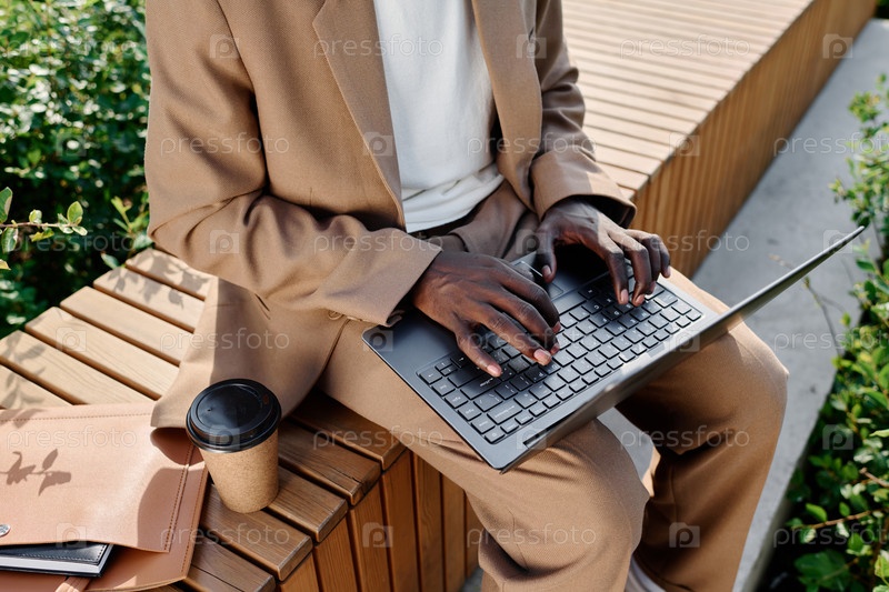 Непризнанный бизнесмен использует ноутбук на открытом воздухе