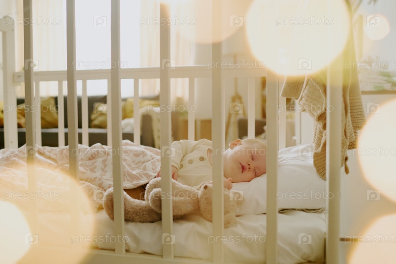 Спящий малыш-мальчик с набитым животным в колыбели