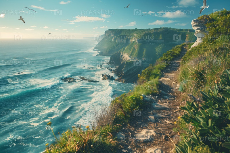 Величественная прибрежная скала с видом на океанские волны, разбивающиеся ниже