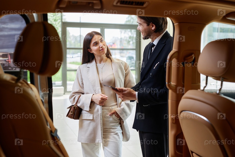 Молодая женщина консультирует автодилера по покупке нового автомобиля в дилерском центре