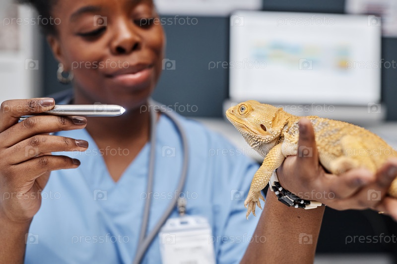 Ветеринар блестит ярким светом в глазах ящериц