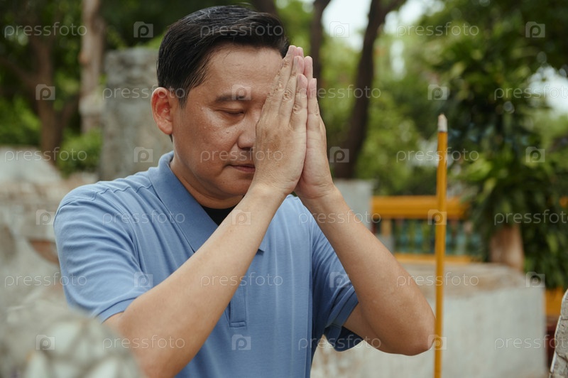 Азиатский мужчина, молящийся в храме