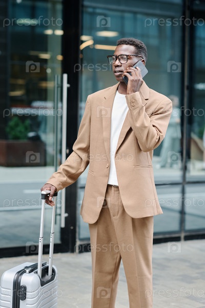 Черный мужчина в деловой поездке разговаривает по телефону