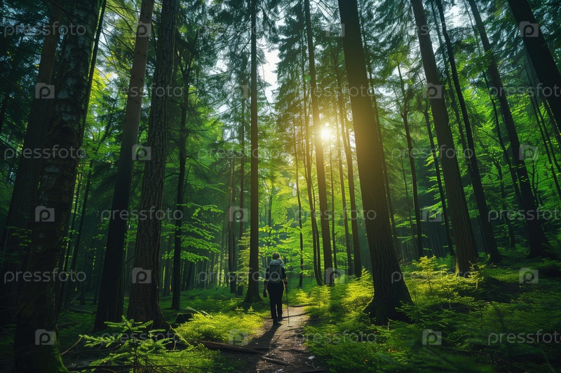 Прогулка по густому лесу, через который фильтруется солнечный свет