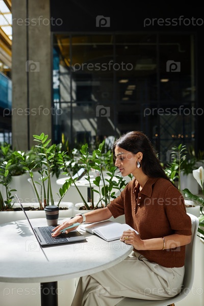 Деловая женщина, использующая ноутбук для работы или учебы за столом в кафе