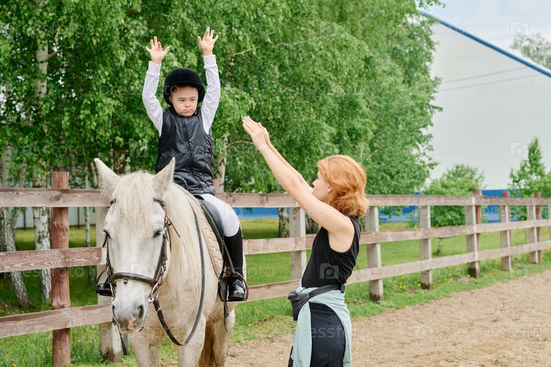 Обучение ребенка верховой езде в открытом воздухе