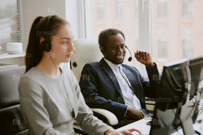 Афроамериканский оператор наслаждается рабочим временем