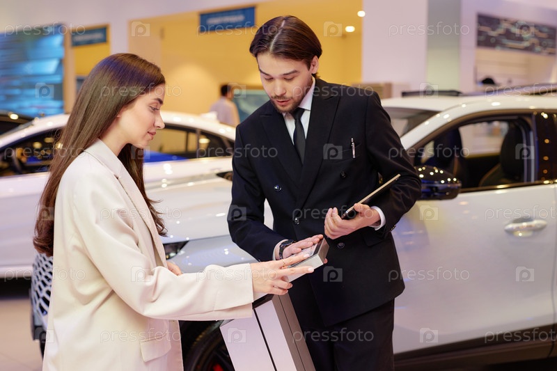 Woman Reading Information on Stand while Dealer Presenting Car at Dealership Center Женщина, читающая информацию о том, как стоять в то время как дилер представляет автомобиль в центре дилеров