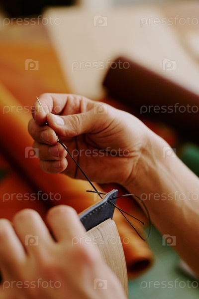 Руки, держащие кожаную заготовку и иглу с ниткой