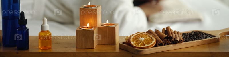 Расслабляющая ароматерапия установка с эссенцией и зажженными свечами