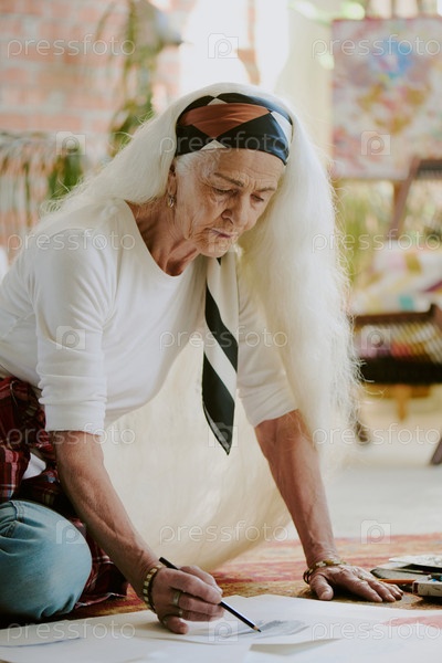 Старшая женщина с длинными волосами рисует, сидя на полу