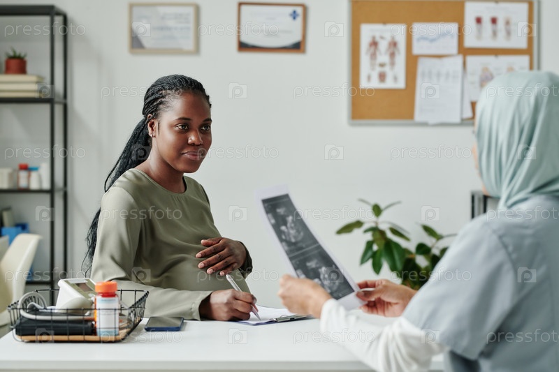 Беременная женщина смотрит на гинеколога
