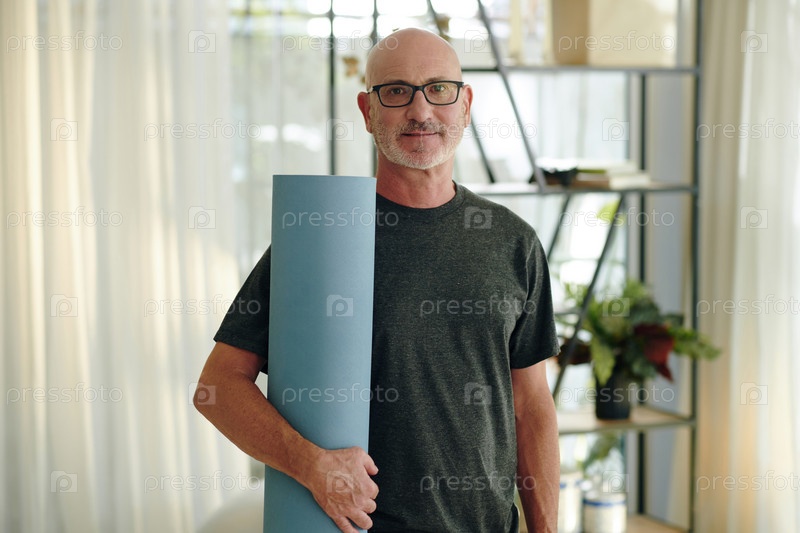 Портрет улыбающегося мужчины, держащего мата для йоги внутри комнаты