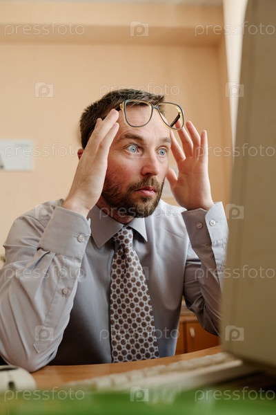 Человек, реагирующий с шоком во время сидения за столом в офисе