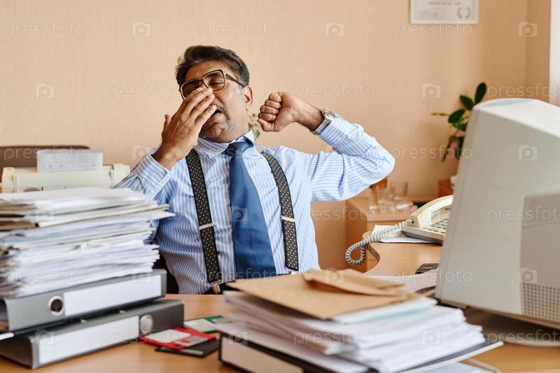 Бизнесмен зевает и растягивается в офисной рабочей зоне