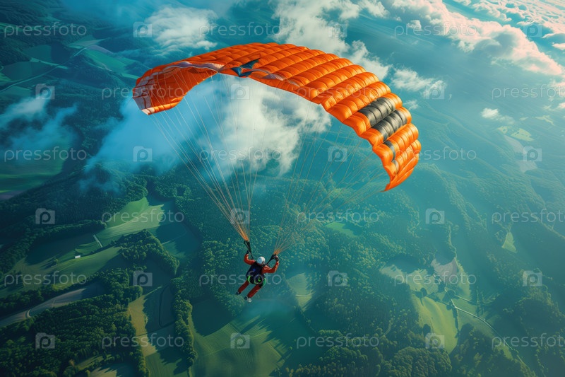 Парашютист спускается по живописной сельской местности под облаками