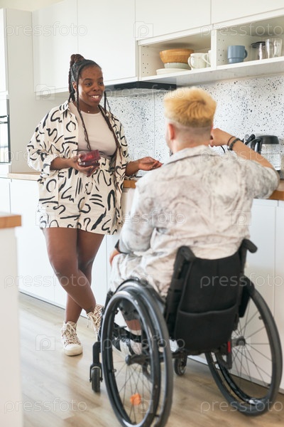 Разговор между стоящей женщиной и мужчиной в инвалидной коляске на кухне