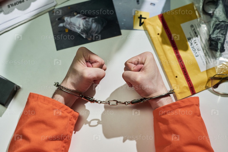 Человек с наручниками, виденный сверху Вид в оранжевом комбинезоне