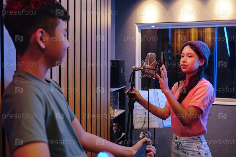 Запись пения в музыкальной студии с микрофоном