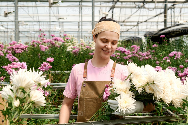 Улыбающаяся женщина держит розовые цветы в качестве садовника